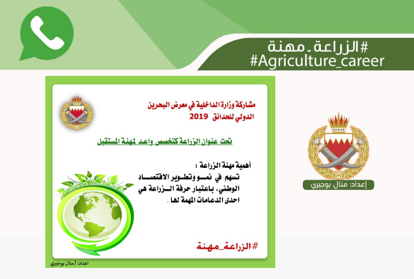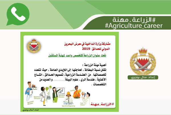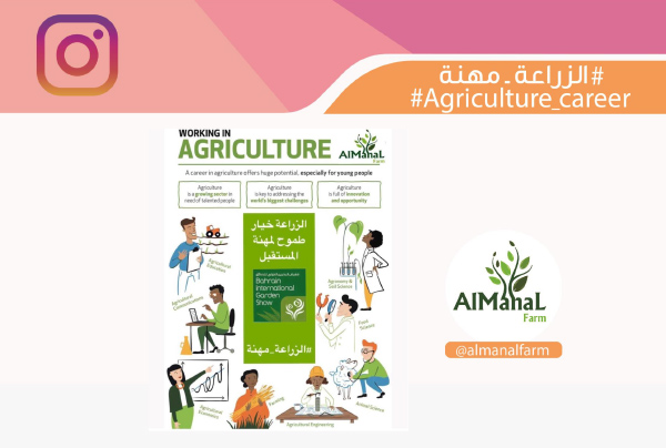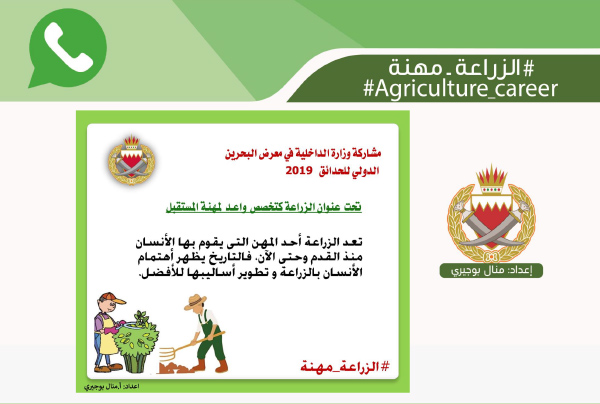 The 2019 Bahrain International Garden Show exhibition carried the slogan " Agriculture as a Promising Career Choice " which focused on agriculture as an ambitious career option to meet the growing demand for experts with the necessary skills, especially in the field of agricultural technology and sustainable agricultural practices. The scope of this specialization includes: food production, management of technical and energy systems, ecosystems, agribusiness and management.